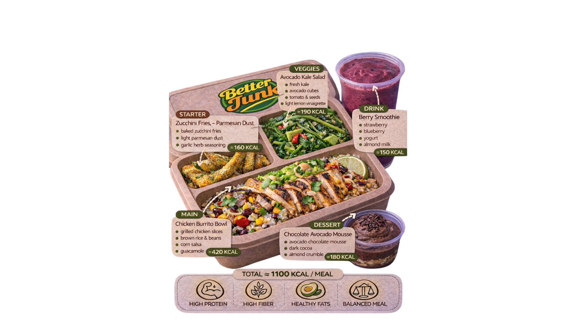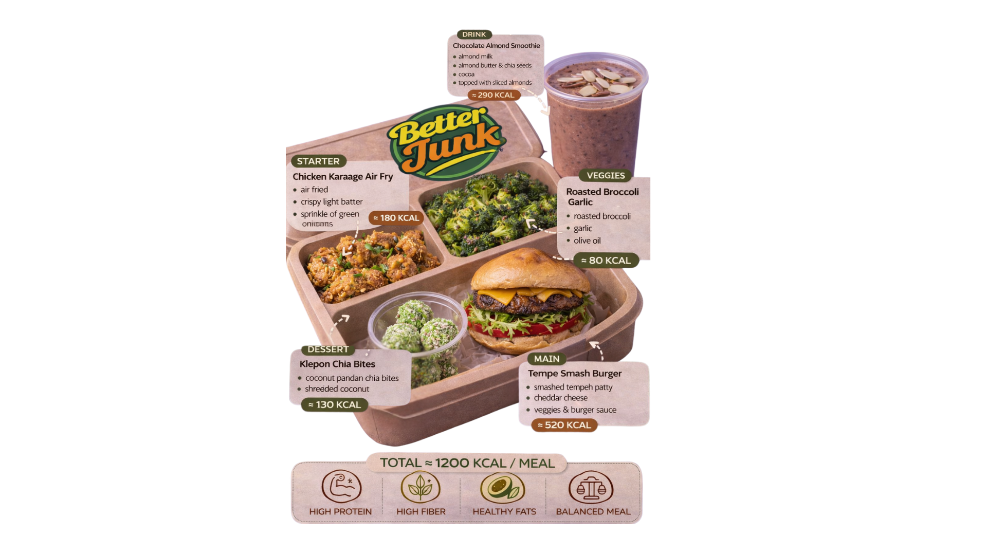 A : Better Junk COCOK banget buat kamu yang suka banget sama junkfood, tapi kamu juga pengen tetap sehat dan bugar. DAN untuk kamu yang si paling sibuk dan bosen dengan catering di kantor? Better Junk Solusinya!